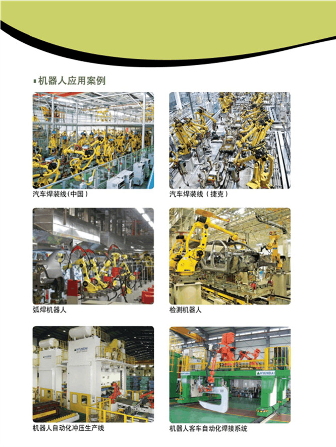 直角坐標型工業機器人 、 圓柱坐標型工業機器人、 圓柱坐標型工業機器人 、多關節型工業機器人、平面關節型工業機器人。弧焊機器人、 激光焊機器人、電阻焊機器人、自動化焊接機器人、點焊機器人、等離子切割機器人、清潔機器人、上料機器人、物料輸送機器人、材料去除機器人、包裝機器人、噴漆機器人、自動鉆孔機器人、堆跺機器人、涂層機器人、去毛刺機器人、磨銷機器人、高溫噴涂機器人等。